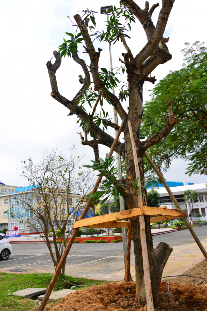 Cây Lộc vừng mới được trồng bổ sung trong khuôn viên Trường đã bắt đầu nảy lộc, đâm chồi trong nắng Xuân