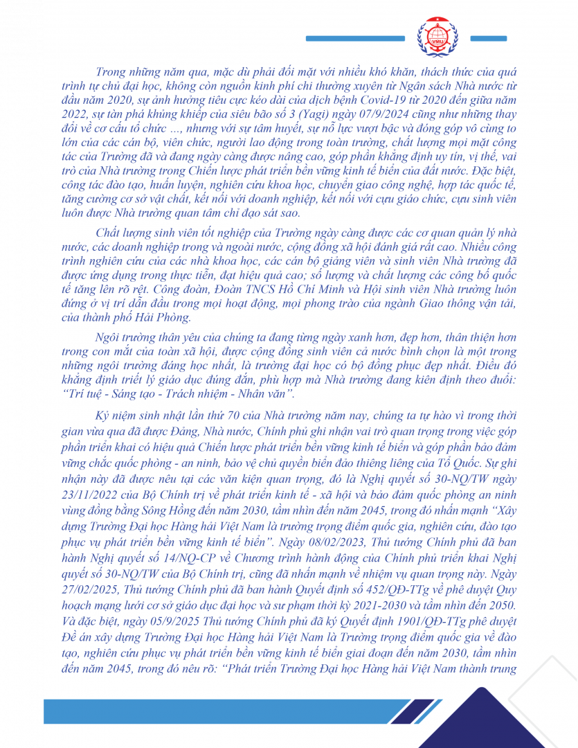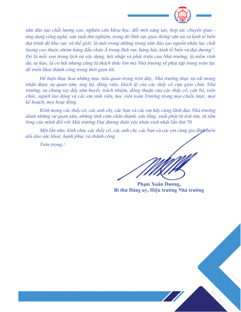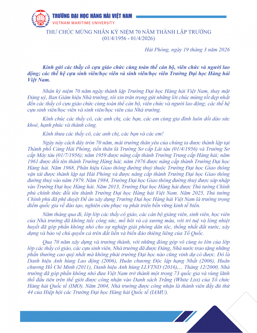 Thư chúc mừng của Hiệu trưởng nhân kỷ niệm 70 năm ngày thành lập Trường Đại học Hàng hải Việt Nam (01/4/1956 - 01/4/2026)