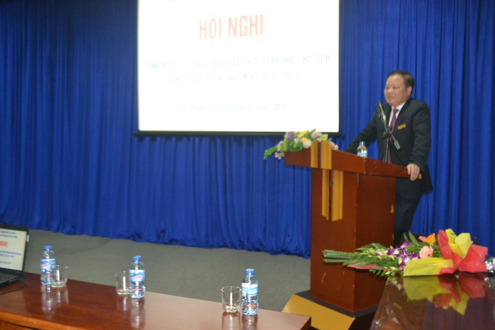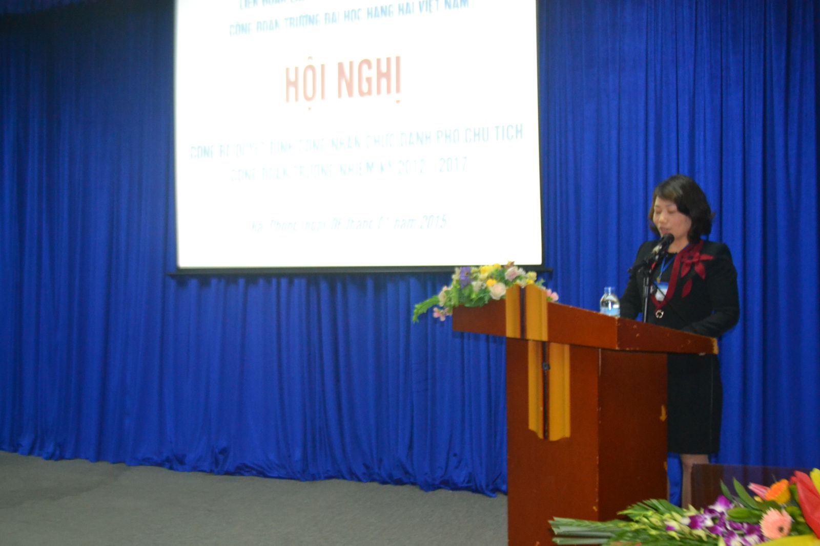 Thừa ủy quyền của Chủ tịch LĐLĐ Thành phố, đồng chí Hoàng Đình Long- Phó Chủ tịch, Trưởng ban tổ chức LĐLĐ Thành phố công bố và trao Quyết định công nhận chức danh Phó Chủ tịch Công đoàn Trường nhiệm kỳ 2012-2017. Căn cứ Điều lệ X Công đoàn Việt Nam và Hướng dẫn số 703/HD-TLĐ ngày 6/5/2009 của Đoàn Chủ tịch Tổng LĐLĐ Việt Nam về thi hành Điều lệ X Công đoàn Việt Nam; Căn cứ Biên bản Hội nghị Ban Chấp hành Công đoàn Trường Đại học Hàng hải Việt Nam họp ngày 23/12/2014; Công văn số 145/CĐ về việc đề nghị công nhận kết quả bổ sung chức danh Phó Chủ tịch Công đoàn Trường Đại học Hàng hải Việt Nam, nhiệm kỳ 2012-2017; công nhận kết quả bầu bổ sung chức danh Phó Chủ tịch Công đoàn Trường Đại học Hàng hải Việt Nam nhiệm kỳ 2012-2017 đối với đồng chí Phạm Thu Thưởng- Ủy viên Ban thường vụ Công đoàn Trường Đại học Hàng hải Việt Nam.