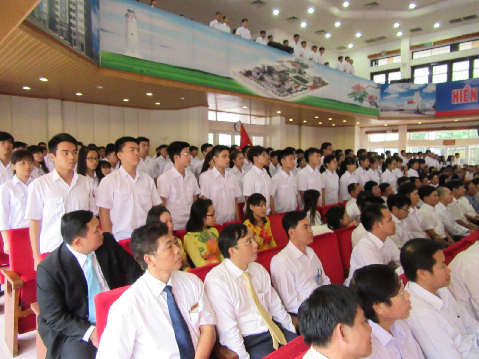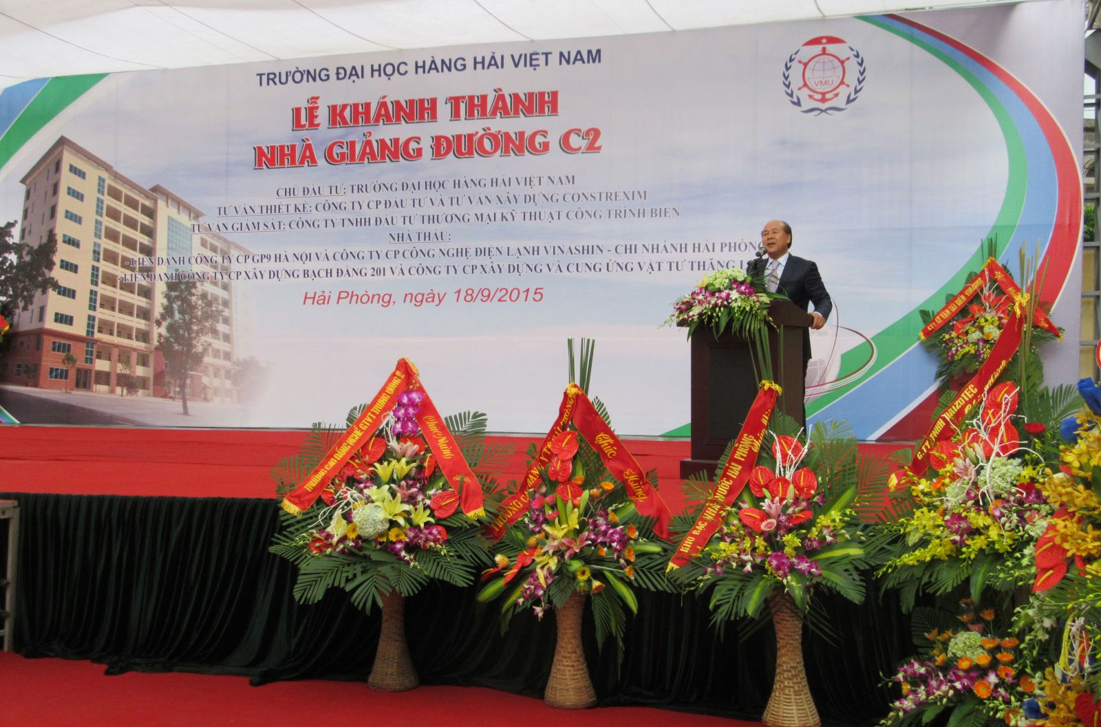 Hòa chung trong không khí tưng bừng phấn khởi của đất nước ta, dân tộc ta với những phút giây hào hùng của mùa thu lịch sử, kỉ niệm trọng thể những ngày lễ lớn: 70 năm ngày cách mạng tháng 8 thành công và quốc khánh 2/9, 70 năm ngày truyền thống ngành Giao thông vận tải, thực hiện sự chỉ đạo của Bộ Giao thông vận tải, được sự nhất trí của các cấp các ngành, 09h00 ngày 18/9/2015 tại hội trường A8, Trường Đại học Hàng hải Việt Nam đã long trọng tổ chức Lễ Khai giảng năm học 2015-2016, đồng thời cắt băng khánh thành, gắn biển Nhà Giảng đường C2.