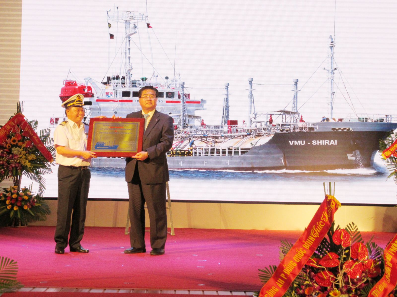 Lãnh đạo đại điện công ty VTB Shirai Shipping Nhật Bản trao tặng tượng trưng tàu LPG trị giá 1.000.000 USD nhằm phục vụ nâng cao chất lượng đào tào thuyền viên và SQHH Việt Nam.