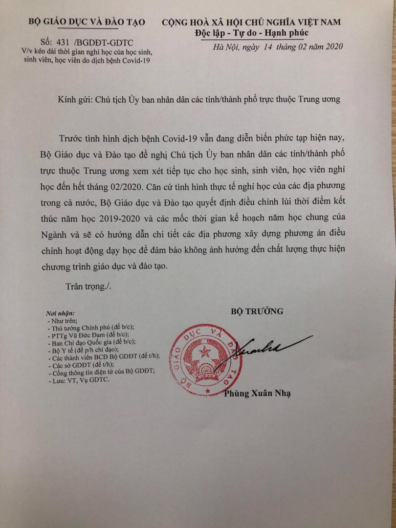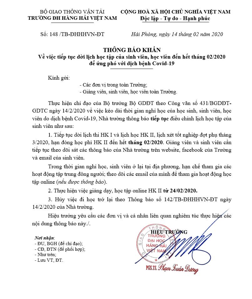 Thông báo KHẨN về việc tiếp tục dời lịch học tập của sinh viên, học viên đến hết tháng 02/2020 để ứng phó với dịch bệnh Covid-19.