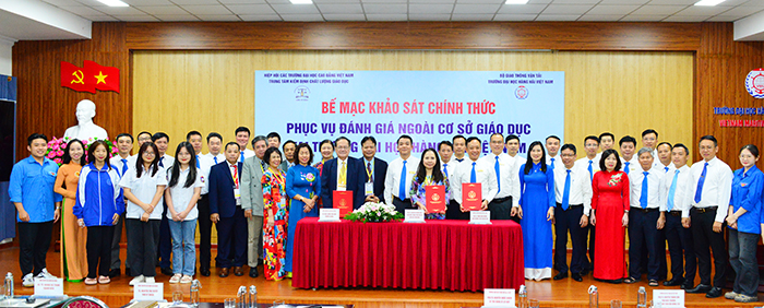 Kết thúc phiên Bế mạc, Giám đốc Trung tâm KĐCLGD - Hiệp hội CTĐHCĐVN, Trưởng đoàn chuyên gia ĐGN và Hiệu trưởng, Chủ tịch Hội đồng Tự đánh giá Trường Đại học Hàng hải Việt Nam đã cùng ký Biên bản hoàn thành đợt khảo sát chính thức phục vụ ĐGN cơ sở giáo dục tại Nhà trường.