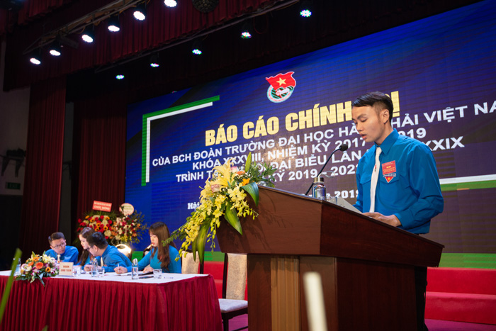 Thay mặt Đoàn chủ tịch, Đồng chí Nguyễn Vương Thịnh - Bí thư ĐTNCS HCM báo cáo tóm tắt công tác Đoàn và phong trào thanh niên nhiệm kỳ 2017 - 2019 và mục tiêu, nhiệm vụ, giải pháp nhiệm kỳ 2019 – 2022. Trong nhiệm kỳ 2017 – 2019 vừa qua, dưới sự lãnh đạo, chỉ đạo của BTV Thành đoàn Hải Phòng và Đảng ủy, Ban Giám hiệu Nhà trường, công tác Đoàn và phong trào thanh niên của Trường Đại học Hàng hải Việt Nam đã đạt được nhiều thành tích rất đáng ghi nhận. Đây cũng là nhiệm kỳ đầu tiên thực hiện Nghị quyết Đại hội Đoàn thành phố lần thứ 13 và Đại hội Đoàn toàn quốc lần thứ 11. Các cấp bộ Đoàn đã không ngừng nỗ lực, phấn đấu vượt qua mọi khó khăn thử thách, phát huy truyền thống vẻ vang của Đoàn TNCS Hồ Chí Minh, của tuổi trẻ để thực hiện thắng lợi các chương trình, phong trào hành động cách mạng, xây dựng tổ chức Đoàn ngày càng vững mạnh; tổ chức vận động, động viên cán bộ, đoàn viên thanh niên không chỉ thực hiện tốt các nhiệm vụ học tập, giảng dạy, nghiên cứu khoa học, chuyển giao công nghệ mà còn tích cực trong đổi mới căn bản toàn diện giáo dục đào tạo, góp phần xây dựng trường Đại học trọng điểm quốc gia, với những giá trị cốt lõi “Trí tuệ - Sáng tạo – Trách nhiệm – Nhân văn” đồng thời tham gia thực hiện các nhiệm vụ chính trị, văn hoá – xã hội, quốc phòng an ninh của thành phố, được Ban Thường vụ Thành Đoàn và Đảng ủy, Ban Giám hiệu nhà trường ghi nhận, biểu dương.
