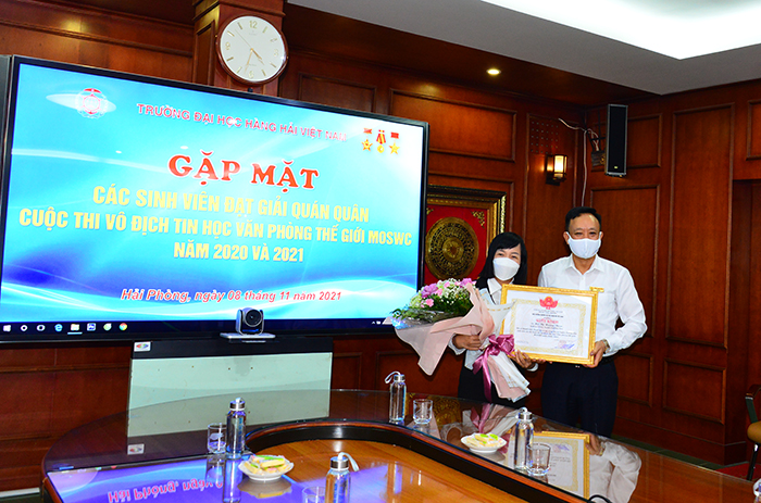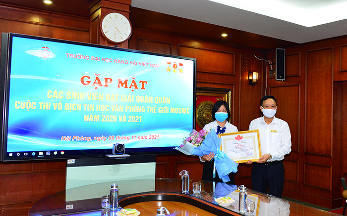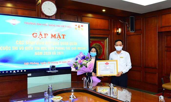 16h00 ngày 08/11/2021, PGS.TS Phạm Xuân Dương – Phó Bí thư Đảng ủy, Hiệu trưởng Trường ĐHHHVN chủ trì buổi Gặp mặt, biểu dương, khen thưởng các SV đạt giải Quán quân Cuộc thi vô địch Tin học Văn phòng Thế giới năm 2020 và 2021 tại Việt Nam và chuẩn bị dự vòng thi Chung kết Thế giới nhằm kịp thời động viên, khen thưởng, chia sẻ niềm vui chiến thắng với thầy, trò tham gia thi đấu.