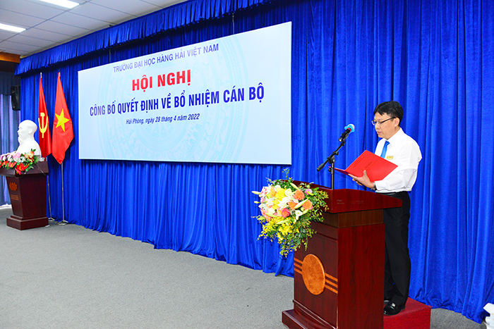 16h00 ngày 28/04/2022, Trường Đại học Hàng hải Việt Nam đã long trọng tổ chức Hội nghị công bố quyết định bổ nhiệm cán bộ thuộc Khoa Máy tàu biển và Trung tâm Huấn luyện thuyền viên dưới sự chủ trì của PGS.TS Phạm Xuân Dương – Phó Bí thư Đảng ủy, Hiệu trưởng Nhà trường nhằm kiện toàn và hoàn thiện bộ máy lãnh đạo của Nhà trường.