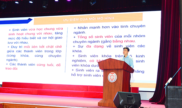 ThS. Ngô Việt Anh - Phó Bí thư Đoàn TNCS HCM, Phó Chủ tịch Hội sinh viên Trường trình bày tham luận: “Các giải pháp nâng cao hiệu quả sinh hoạt chi đoàn theo mô hình Nhóm sinh viên chuyên ngành.”