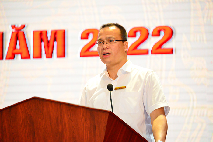 Đồng chí Trương Công Mỹ - Trưởng phòng Công tác sinh viên báo cáo tổng kết công tác CVHT năm 2020-2021