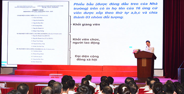 Thực hiện chỉ đạo của của Bộ Giao thông vận tải tại Công văn số 1484 ngày 24/2/2020 về việc thành lập Hội đồng trường đại học, học viện và Thông báo số 92 ngày 10/3/2020 thông báo kết luận của Bộ trưởng Bộ Giao thông vận tải về việc thực hiện các quy định của pháp luật trong tổ chức hoạt động của Hội đồng trường các trường đại học, học viện, cao đẳng; Căn cứ Luật Giáo dục đại học (năm 2012), Luật Sửa đổi bổ sung một số điều của Luật Giáo dục đại học (năm 2018), Nghị định số 99 ngày 30/12/2019 của Chính phủ quy định chi tiết và hướng dẫn thi hành một số điều của Luật Sửa đổi, bổ sung một số điều của Luật Giáo dục đại học, sáng ngày 12/5/2020, Trường Đại học Hàng hải Việt Nam long trọng tổ chức Hội nghị đại biểu cán bộ, viên chức, nhà giáo, người lao động bầu Hội đồng trường nhiệm kỳ 2020 - 2025.