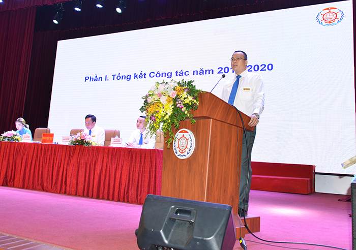 PGS.TS Nguyễn Minh Đức – Phó Hiệu trưởng Nhà trường báo cáo tổng kết công tác năm học 2019-2020 và định hướng trọng tâm năm học 2020-2021