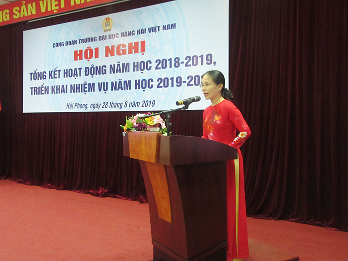 Dưới sự chủ trì của đồng chí Phạm Ngọc Tuyền – Chủ tịch Công đoàn Trường, Hội nghị được nghe đồng chí Phạm Thu Thưởng- UV BCH LĐLĐ TP Hải Phòng, Phó Chủ tịch thường trực Công đoàn Trường thay mặt Ban Chấp hành trình bày báo cáo tổng kết hoạt động công đoàn năm học 2018-2019 và phương hướng, nhiệm vụ năm học 2019-2020. Theo báo cáo, năm học 2018-2019 là năm đầu thực hiện Nghị quyết Đại hội XIV Công đoàn thành phố, Đại hội XII Công đoàn Việt Nam; là năm toàn Ngành Giáo dục sơ kết 5 năm thực hiện Nghị quyết 29-NQ/TW về đổi mới căn bản, toàn diện giáo dục và đào tạo. Năm học 2018-2019, các cấp Công đoàn của Trường đã phát động nhiều phong trào thi đua chào mừng kỷ niệm 90 năm thành lập Công đoàn Việt Nam (28/7/1929-28/7/2019). Toàn Trường tích cực thi đua, đổi mới nội dung chương trình đào tạo và phương pháp đánh giá kết quả học tập của sinh viên, xây dựng và triển khai chương trình đào tạo theo phương pháp tiếp cận CDIO nhằm từng bước cải tiến chất lượng dịch vụ đào tạo hướng đến người học, xây dựng chương trình theo chuẩn quốc tế AUN nhờ đó nâng cao chất lượng đào tạo, góp phần hoàn thành xuất sắc nhiệm vụ năm học.