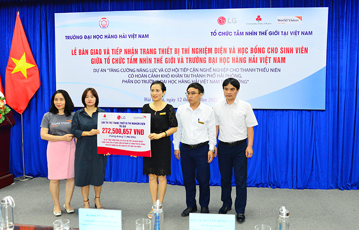 Sáng ngày 12/5, tại Trường Đại học Hàng hải Việt Nam đã diễn ra Lễ bàn giao và tiếp nhận trang thiết bị thí nghiệm điện và học bổng cho sinh viên giữa Tổ chức Tầm nhìn Thế giới và Trường Đại học Hàng hải Việt Nam. Tới dự có PGS.TS Nguyễn Hồng Vân – Phó Bí thư Đảng ủy, Trưởng phòng Quan hệ quốc tế; Bà Vũ Thị Đủ - Trưởng Chương trình vùng Quận Ngô Quyền, Tổ chức Tầm nhìn Thế giới (World Vision International) tại Việt Nam; Bà Đinh Thị Thúy Anh – Trưởng phòng Văn hóa Hành chính, Công ty TNHH LG Electonics Việt Nam; cùng sự có mặt của các đồng chí lãnh đạo đại diện các Khoa/Viện trong Trường và 40 em sinh viên nhận học bổng.