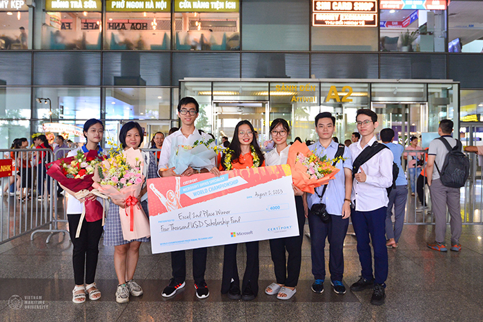 Sáng 04/08, đội tuyển Việt Nam trong đó có hai sinh viên Trường Đại học Hàng hải Việt Nam (SV Nguyễn Thị Thanh Trúc - Lớp LQC61ĐH - giải Nhất quốc gia nội dung thi Excel 2016 và SV Phạm Trung Nam - Lớp KTN60ĐH - giải Nhất quốc gia nội dung thi Excel 2019) tham dự Cuộc thi Vô địch tin học văn phòng thế giới 2023 hạ cánh tại Sân bay Nội Bài, Hà Nội. Đội truyển MOS Trường Đại học Hàng hải Việt Nam do PGS.TS Phạm Xuân Dương - Hiệu trưởng làm Trưởng đoàn. Tham gia lễ đón đội tuyển Việt Nam trở về có Lãnh đạo của IIG Việt Nam và Trường Đại học Hàng hải Việt Nam cùng đại diện các đồng chí lãnh đạo Phòng/Ban, Đoàn TNCS Hồ Chí Minh, Hội Sinh viên Trường.