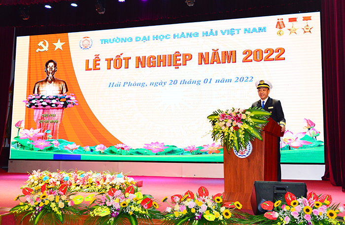Để đến được Lễ trao bằng tốt nghiệp hôm nay, chúng ta đã trải những học kỳ chưa từng có tiền lệ, phải đối mặt với những khó khăn, thách thức trong bối cảnh đại dịch Covid-19. Thầy trò chúng ta đã từng lo lắng, với nhiều băn khoăn, nhiều câu hỏi, mà một trong những câu hỏi quan trọng đó là liệu các em có kịp hoàn thành toàn bộ chương trình đào tạo để tốt nghiệp đúng hạn trong năm 2022 này không? Và câu trả lời ngày hôm nay là với sự đoàn kết đồng lòng, với sự kết nối và sẻ chia, với bản lĩnh, tinh thần luôn bên nhau và vượt qua tất cả. Hãy cùng nhau trân trọng và giữ vững sự kết nối ấy, tinh thần ấy bởi các em luôn có một mái nhà mang tên Mái trường Đại dương, có một gia đình mang tên Trường Đại học Hàng hải Việt Nam sẵn sàng dang tay chào đón các em như đón những đứa con đi xa trở về nhà.