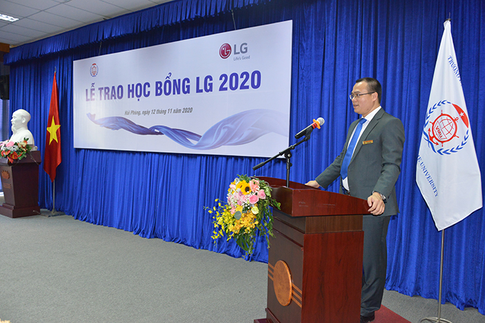 Ông Kwon Gi Jun – Giám đốc khối hỗ trợ kinh doanh và thương mại của Công ty LG bày tỏ niềm phấn khởi khi lần đầu đến thăm Trường Đại học Hàng hải Việt Nam và cảm ơn sự đón tiếp nồng ấm của Nhà trường. Ông cũng nhấn mạnh Công ty LG là một công ty có vốn đầu tư nước ngoài lớn, doanh thu trong năm 2019 – 2020 đạt hơn 6 tỷ đô. Công ty LG tại Hải Phòng là một trong những chi nhánh có quy mô lớn nhất tại Việt Nam. Ông Kwon Gi Jun mong muốn phát triển hơn nữa mối quan hệ hợp tác với Trường Đại học Hàng hải Việt Nam trong đào tạo nguồn nhân lực chất lượng cho Công ty LG trong thời gian tới. Với những sinh viên được nhân học bổng, ông Kwon Gi Jun mong muốn phần thưởng này sẽ là động lực giúp các em phấn đấu học tập tốt, trở thành những sinh viên giỏi về chuyên môn và kỹ năng công nghệ. Đặc biệt ông cũng nhấn mạnh ngoài Tiếng Anh, các sinh viên nên trau dồi thêm tiếng Hàn sẽ là một lợi thế. Ông hy vọng các bạn sinh viên sẽ lựa chọn Công ty LG là nơi công tác, cùng tham gia cống hiến đóng góp cho sự phát triển của ngôi nhà chung của Công ty LG.