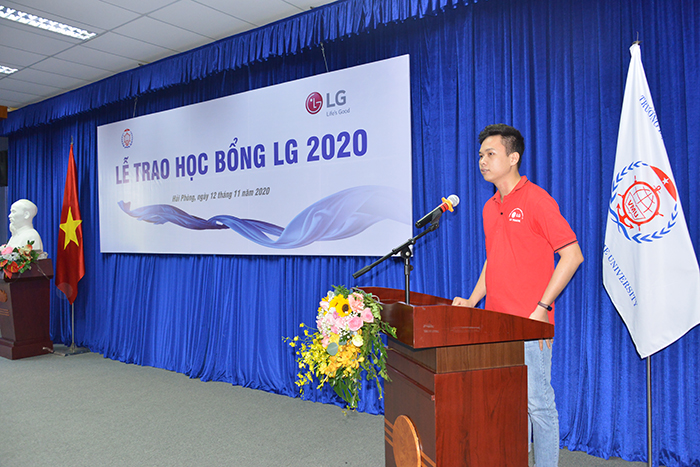 Sinh viên Nguyễn Xuân Vinh – Kỹ thuật cơ khí phát biểu cảm ơn Nhà trường và Công ty LG Electronics Việt Nam Hải Phòng