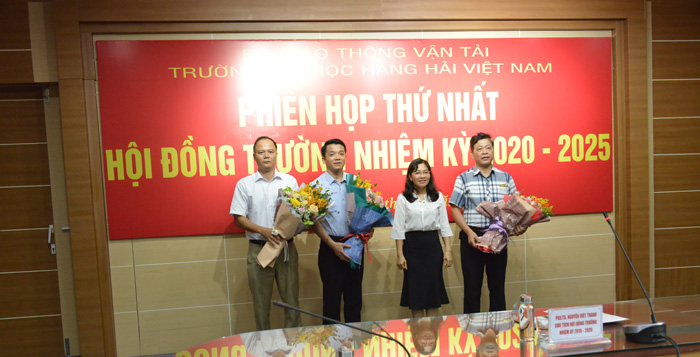 Đồng chí Lê Thanh Hà - Phó Vụ trưởng Vụ Tổ chức cán bộ, Bộ Giao thông vận tải, thành viên Hội đồng trường nhiệm kỳ 2020 - 2025 đã thay mặt lãnh đạo Bộ Giao thông vận tải và các thành viên trong Hội đồng lên tặng hoa chúc mừng các đồng chí vừa trúng cử vào các chức danh chủ chốt của Hội đồng.