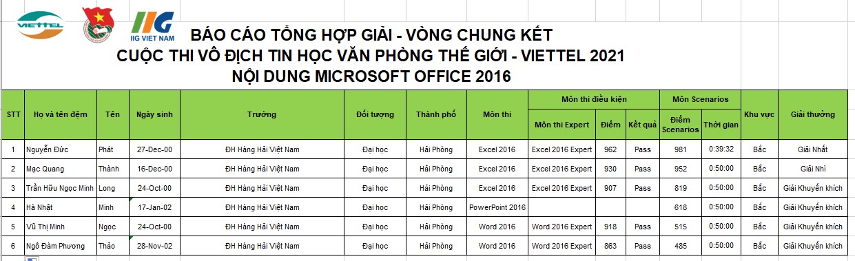 Trải qua hai vòng thi cấp quốc gia nghiêm ngặt và gay cấn, các thí sinh đến từ Trường Đại học Hàng hải Việt Nam đã xuất sắc vượt qua các thí sinh và giành giải thưởng quốc gia của cuộc thi năm 2021. Nhà trường có 06 giải bao gồm 01 giải Nhất, 01 giải Nhì và 04 giải Khuyến khích. Đặc biệt, em Nguyễn Đức Phát đã trở thành Tân Vô địch quốc gia nội dung thi Microsoft Excel 2016 và sẽ đại diện Việt Nam tranh tài tại Vòng chung kết thế giới tại sẽ diễn ra vào tháng 11/2021.