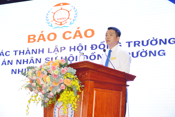 Sau phần khai mạc và giới thiệu đại biểu, PGS.TS. Đỗ Quang Khải - Phó Chủ tịch Hội đồng trường nhiệm kỳ 2020-2025 đã báo cáo tóm tắt hoạt động của Hội đồng trường nhiệm kỳ 2020-2025. Tiếp nối chương trình, PGS.TS. Nguyễn Khắc Khiêm - Bí thư Đảng ủy, Chủ tịch Hội đồng trường nhiệm kỳ 2020-2025 đã thông qua Đề án nhân sự Hội đồng trường Trường Đại học Hàng hải Việt Nam nhiệm kỳ 2025 – 2030, đồng thời nhấn mạnh vai trò then chốt của Hội đồng trường trong việc định hướng chiến lược phát triển Trường, phát huy tốt chức năng quản trị và giám sát, qua đó khẳng định việc kiện toàn Hội đồng trường là bước đi cần thiết nhằm đáp ứng yêu cầu đổi mới quản trị đại học trong giai đoạn tới.