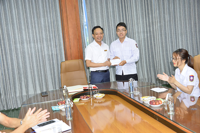 Đồng chí Lê Hoàng Dương – Bí thư Đoàn Thanh niên, Chủ tịch Hội sinh viên cùng đồng chí Nguyễn Mạnh Cường – Phó Bí thư Đoàn thanh niên trao bằng khen cho các em sinh viên.