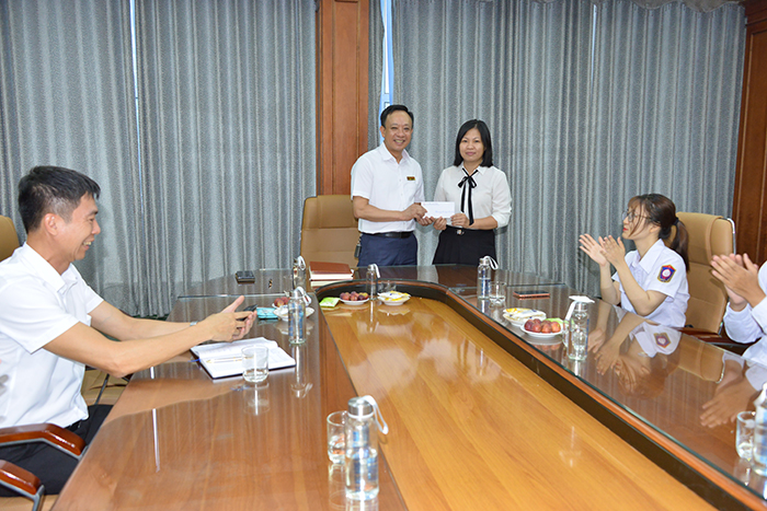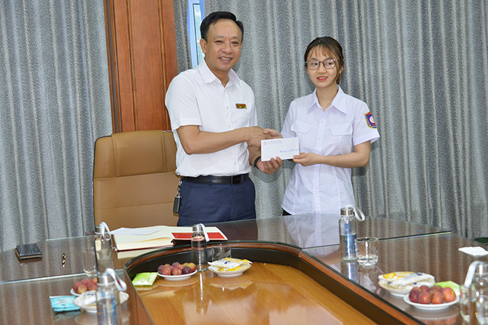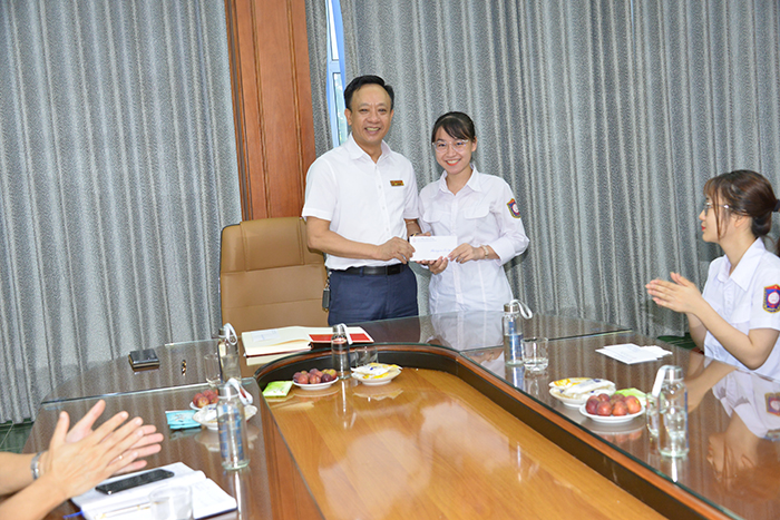 Thầy Hiệu trưởng trao phần thưởng cho sinh viên Thái Bảo Ngọc - KTN59ĐH đã xuất sắc đạt giải Nhất môn MOS Excel