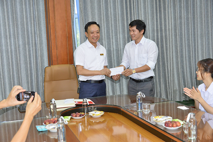 Thầy Hiệu trưởng trao phần thưởng cho giảng viên hướng dẫn Võ Huy Thưởng