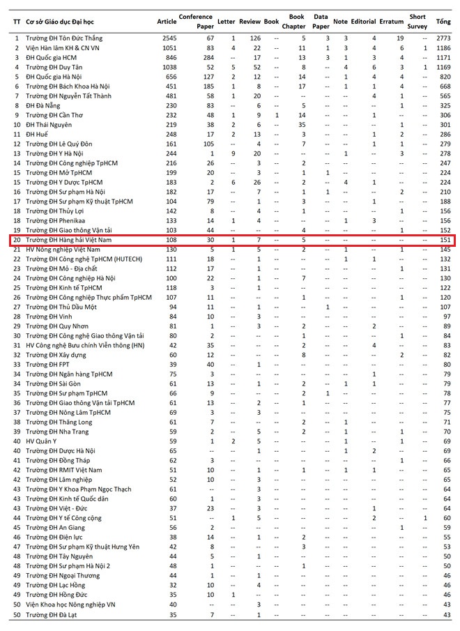 Theo công bố của DTU, Trường Đại học Hàng hải Việt Nam đứng ở vị trí 20/50 trường đại học với các chỉ số thống kê là tổng số các công bố thuộc các loại hình được tổng hợp. Cụ thể trong tổng số 151 công bố khoa học trên Scopus, Trường Đại học Hàng hải Việt Nam nổi trội với loại hình bài báo (Article và Article in press) với 108 công bố.