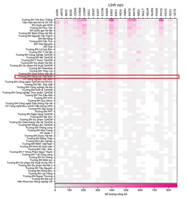Thứ tự các trường được sắp xếp theo tổng số lượng công bố các loại giảm dần. Màu càng đậm thể hiện số lượng càng nhiều, màu trắng tương ứng số công bố bằng 0.